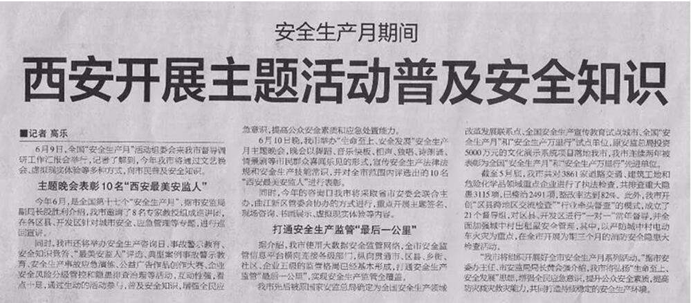 (一)6月11日《西安日報》A10版、6月10日《西安晚報》A2版均報道了安全生產(chǎn)月期間西安開展主題活動普及安全知識相關(guān)內(nèi)容。